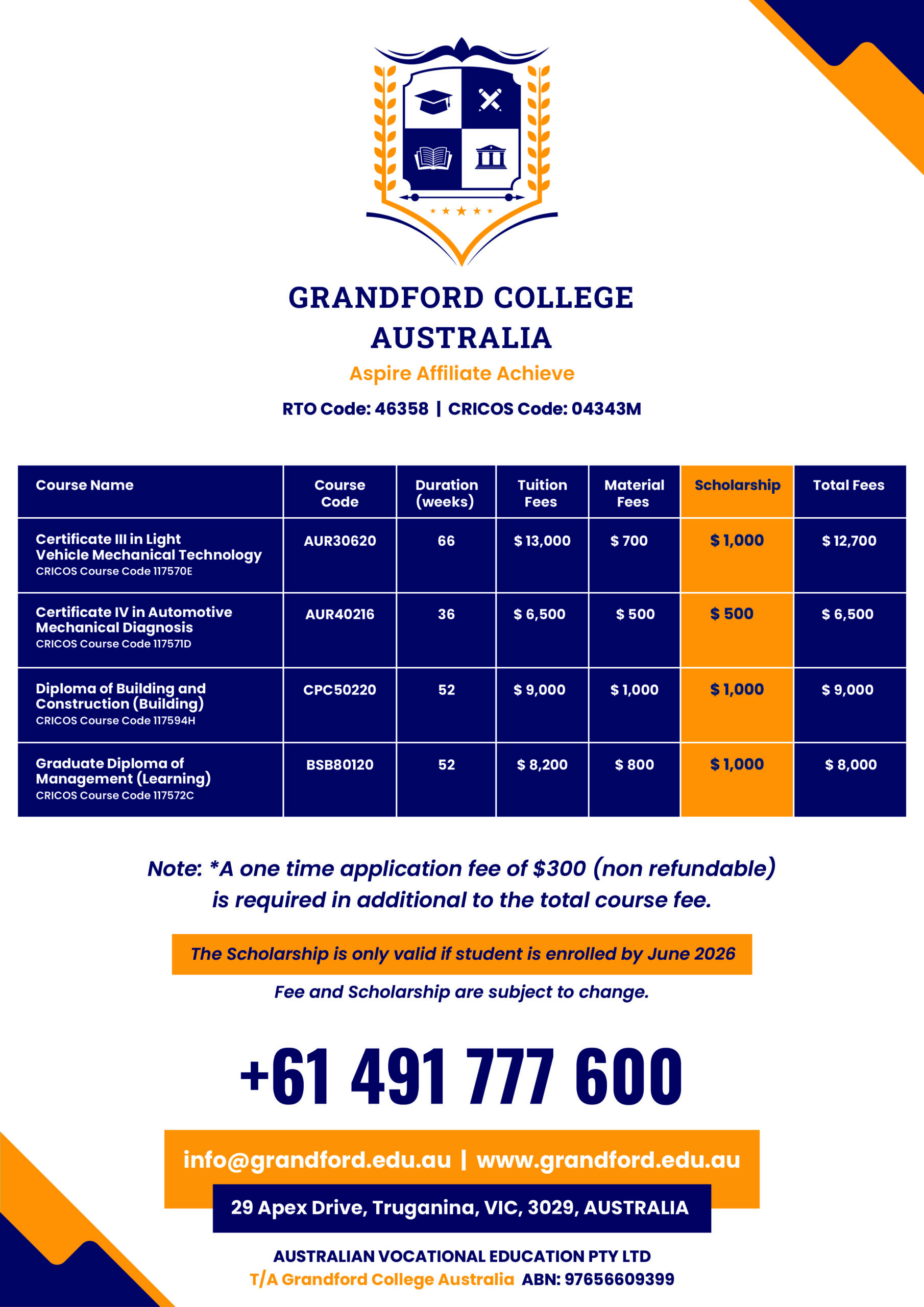 Explore comprehensive fee information for all programs and courses offered at Grandford College Australia. Whether you’re planning to enrol in vocational training or pathway programs, our clear and transparent fee structure helps you make informed decisions about your education investment. Stay up to date with the latest tuition costs and plan your academic journey with confidence.